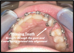 As Emily was prepared for the surgery, Dr Maloney and his team meticulously planned each step and prepared her by placing her upper braces in place with a spring to open the space for the tooth to emerge. The surgical exposure would involve uncovering the impacted tooth beneath the gum and guiding it into the correct position using a special bracket and wire. A local Oral and Maxillofacial Surgeon performed the surgical exposure. With the precision of a skilled craftsman, the surgeon made a small incision to reveal the hidden canine, then attached a tiny bracket to the tooth, carefully avoiding causing any discomfort to Emily.
